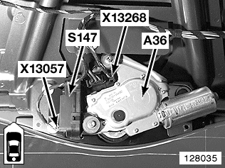 The rear window wiper is switched off when the rear window is open (S147). After closing the rear window, the rear window wiper is not switched on again before it is switched off and on at the wiper switch (S5) or before terminal R is switched off and on. The rear window contact is connected directly to the control unit (A36) for the rear window wiper.