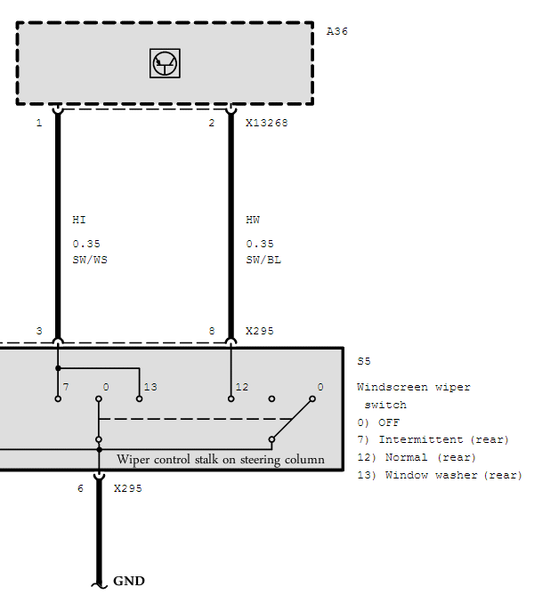 S147 is the switch that detects if the rear window is open, S5 is the wiper stalk on the steering column, M95 is the rear washer pump motor, A1 is the General Module 5. The A36 module sends the current status of the rear window ajar sensor to the general module over wire WSK.